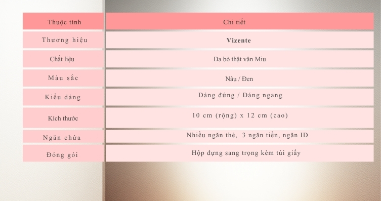 Ví da bò vân Miu Vizente là sự kết hợp hoàn hảo giữa phong cách cổ điển và tinh thần hiện đại. Được chế tác từ da bò thật cao cấp với bề mặt vân Miu độc đáo, sản phẩm mang đến cảm giác sang trọng, mềm mại và bền bỉ theo thời gian. Thiết kế gồm hai phiên bản: dáng đứng và dáng ngang, phù hợp với nhiều phong cách và nhu cầu sử dụng khác nhau. Ví có hai lựa chọn màu sắc thanh lịch: nâu trầm ấm và đen lịch lãm, dễ dàng phối hợp với trang phục công sở hay dạo phố. Với kích thước nhỏ gọn 10x12 cm, ví vẫn đảm bảo đủ không gian cho các vật dụng thiết yếu như tiền mặt, thẻ ngân hàng, giấy tờ tùy thân.